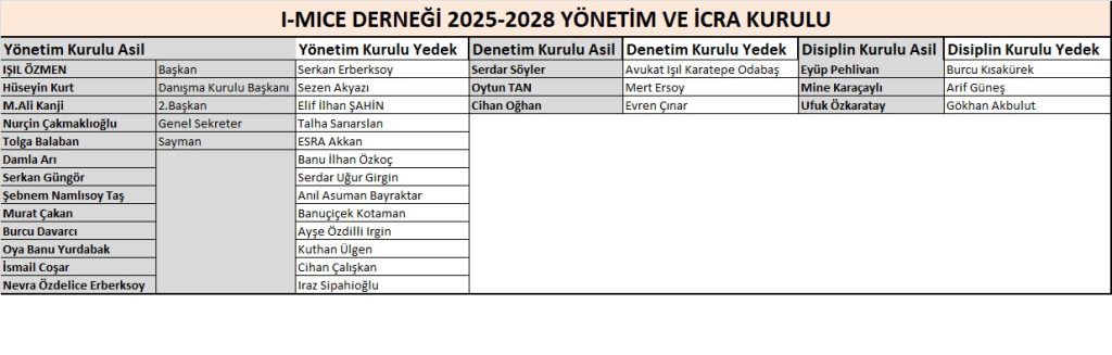 Yeni dönemde göreve gelen yönetim ve icra kurulu üyelerinin farklı disiplinlerden gelen, sektörde deneyimli ve vizyoner isimlerden oluştuğunu vurgulayan Özmen; kadın temsiliyetinin artması, genç profesyonellerin komitelerde yer alması ve STK iş birlikleriyle güçlenen yapının, I-MICE’in daha da kurumsallaşacağının bir göstergesi olduğunu belirterek sözlerini yeni yönetim kadrosunu açıklayarak tamamladı.