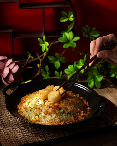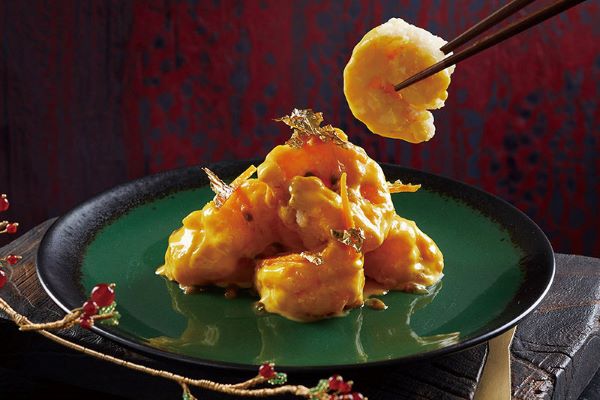 Şefin tadım menüsünde öne çıkan lezzetlerden biri olan mango sosu ve çarkıfelek meyvesiyle kaplanmış çıtır karides, yenilikçi ve özgün yaklaşımın en güzel örneklerinden. Hafif tempura hamuru, çıtır pirinç taneleriyle hoş bir kontrast oluştururken, mango ve çarkıfelek sosunun tatlılığı karidesin doğal tadıyla dengelenerek alışılmışın dışında ama tanıdık bir tat uyumu yaratıyor. Menüde ayrıca, taze mısır, yengeç eti ve karabiberle tatlandırılan tavuk çorbası, beyaz trüf yağı aromasıyla zenginleştirilmiş olarak sunuluyor. Ardından, badem parçacıkları ve kuşkonmaz eşliğinde buharda pişirilmiş ıstakoz yer alıyor. Ana yemek olarak, kültür mantarı sosuyla tamamlanan beyaz turp ile servis edilen mermer desenli dana antrikot öne çıkıyor. Menüyü, Shang Palace’a özgü deniz mahsullü kızarmış pilav takip ederken, yeşil elma jölesi ve sarı erikli hafif tatlı zarif bir kapanış yapıyor.